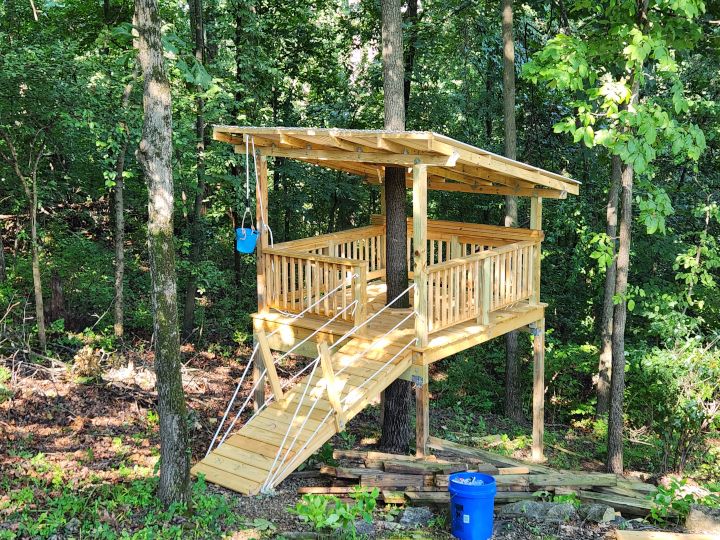 Our house is 3,600 sq. ft. with 4 bedrooms and 3.5 bathrooms. Plenty of space for your child to play. The best part is the playroom downstairs that's just for kids. Our daughter spends so much time there. We are on 0.6 acres, but the backyard is a wooded area which we have built a treehouse to play in! But if it's not quite treehouse weather, then we spend plenty of time on the covered porch eating ice cream, blowing bubbles, or drawing with chalk.
