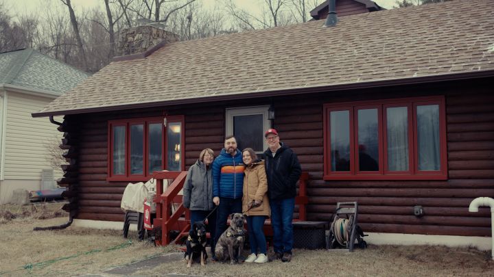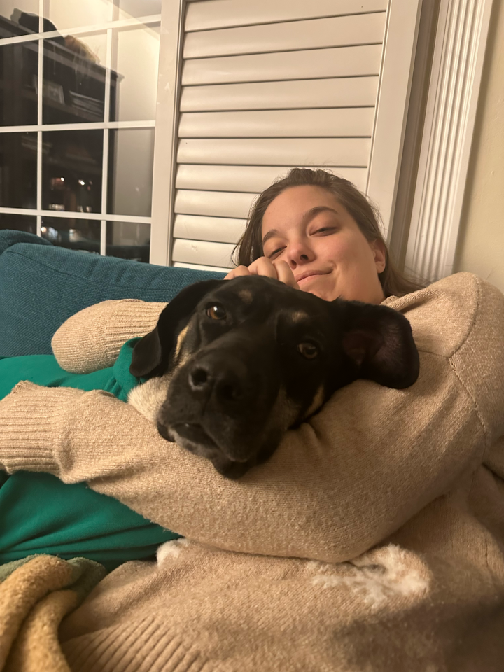 We live in a three-bedroom house with a big back yard. Our backyard has a low fence, so we often hang out with our neighbors when they're out. The dogs love saying hi to the neighbor dogs and running around with them. For the past two years, baby bunnies have nested in our backyard, and we have protected them and watched them grow up; the neighbors and their kids love coming over and checking on the bunnies' progress. We have a finished basement that we've put a projector in to make a small movie theater. Our favorite part of the house is our sunroom. Beth's work desk is there, and Tom put his exercise equipment there. It gets full of natural light and our dogs love to lay in the sunbeams.