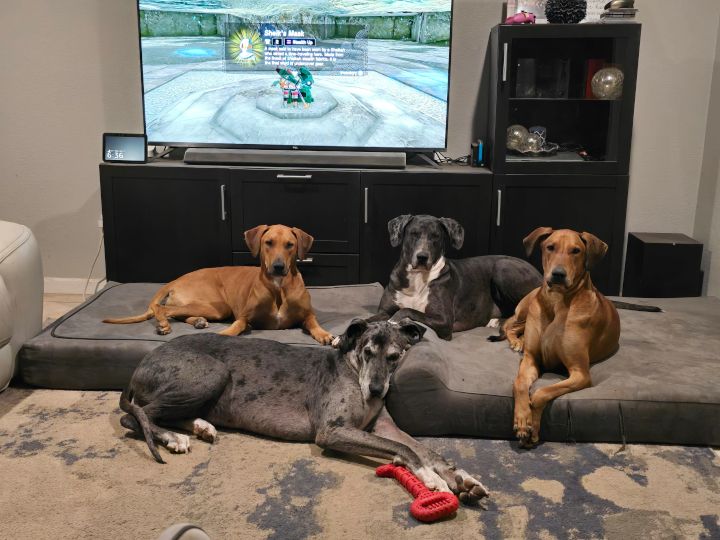 Sgt. Pepper is 8 years old, and we have had her since she was a puppy. She started The Beatles naming scheme. Chyree and Nick are both big fans of The Beatles and have named (almost) all of their pups accordingly. Pepper is a full blooded Great Dane, or small horse, and still acts like a lap dog. She loves to cuddle her giant Christmas Pickle plush and loves warm blankets. Riggsy was adopted in 2023 after we lost our 15 year old pup, Anna IV. Pepper was definitely feeling lonely and needed a friend, and BOY did we deliver. Riggsy turned out to be pregnant when we adopted her, and she had 15 puppies! From the litter, we kept two puppies and named them Penny Lane and Anna V. Anna V comes after Anna IV, who Nick and Chyree adopted shortly after marriage and spent her entire 15-years making their lives more full. Penny is a little firecracker who has Chyree wrapped around her finger (…paw?), and she definitely knows it.