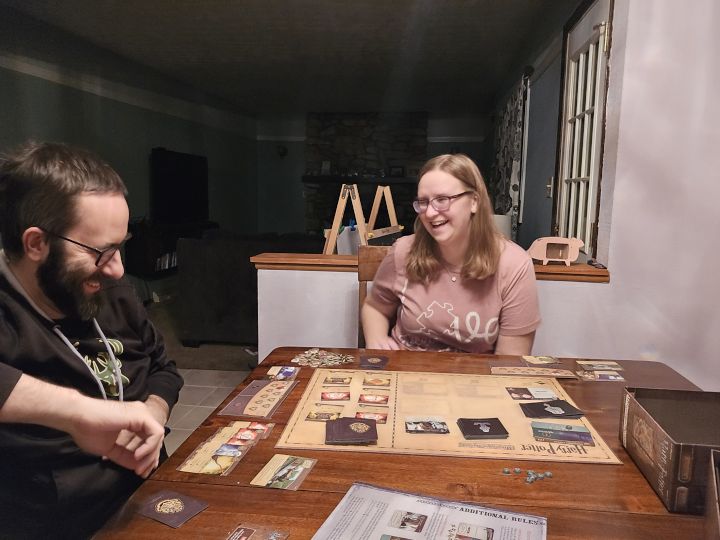 We also enjoy playing board and card games. We play a cooperative card game based on Harry Potter together. We occasionally have card game nights with both our families where we play games like Rummy 500. At home we've begun teaching our son games like Sorry and matching games.