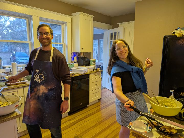 While we come from different backgrounds, we are looking to raising our child in the Jewish tradition. We observe Shabbat most Friday nights with candle lighting, homemade challah bread, and time together at the table, and we look forward to sharing major holidays and these weekly rituals with our child. With family we have close by in Colorado, we are also building on traditions such as “latke-thon” - a marathon afternoon of making hundreds of latkes as a family to share through Hanukkah and the year to come.