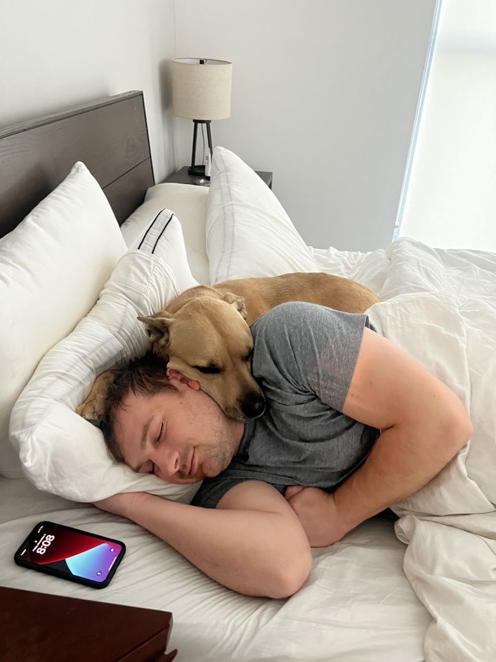 We have one dog, Angelo. He is 8 years old and a true mixed breed. We rescued him from a shelter as a puppy, and our friends and family like to say he looks like a blonde Scooby Doo. He is the sweetest, smartest, goofiest, gentlest, and most snuggly dog you’ll meet. He loves to go for walks, play in the snow, but above all else, he loves to snuggle—on the couch, wrapped up in a blanket, buried in a pile of pillows, you name it. He’s also so sweet with our friends’ babies and toddlers, keeping his distance unless they approach him, and then gently “booping” them on the nose with his nose.